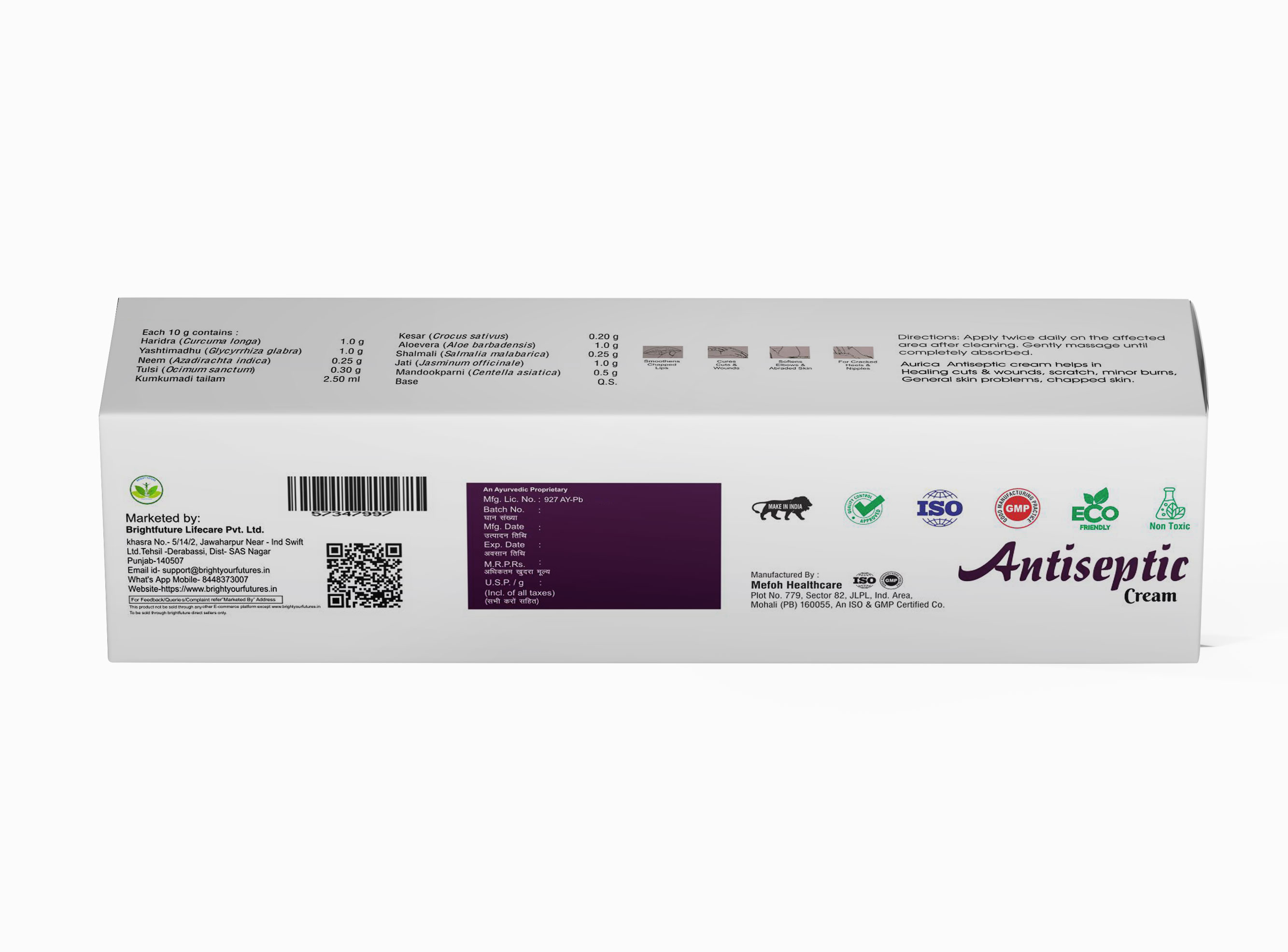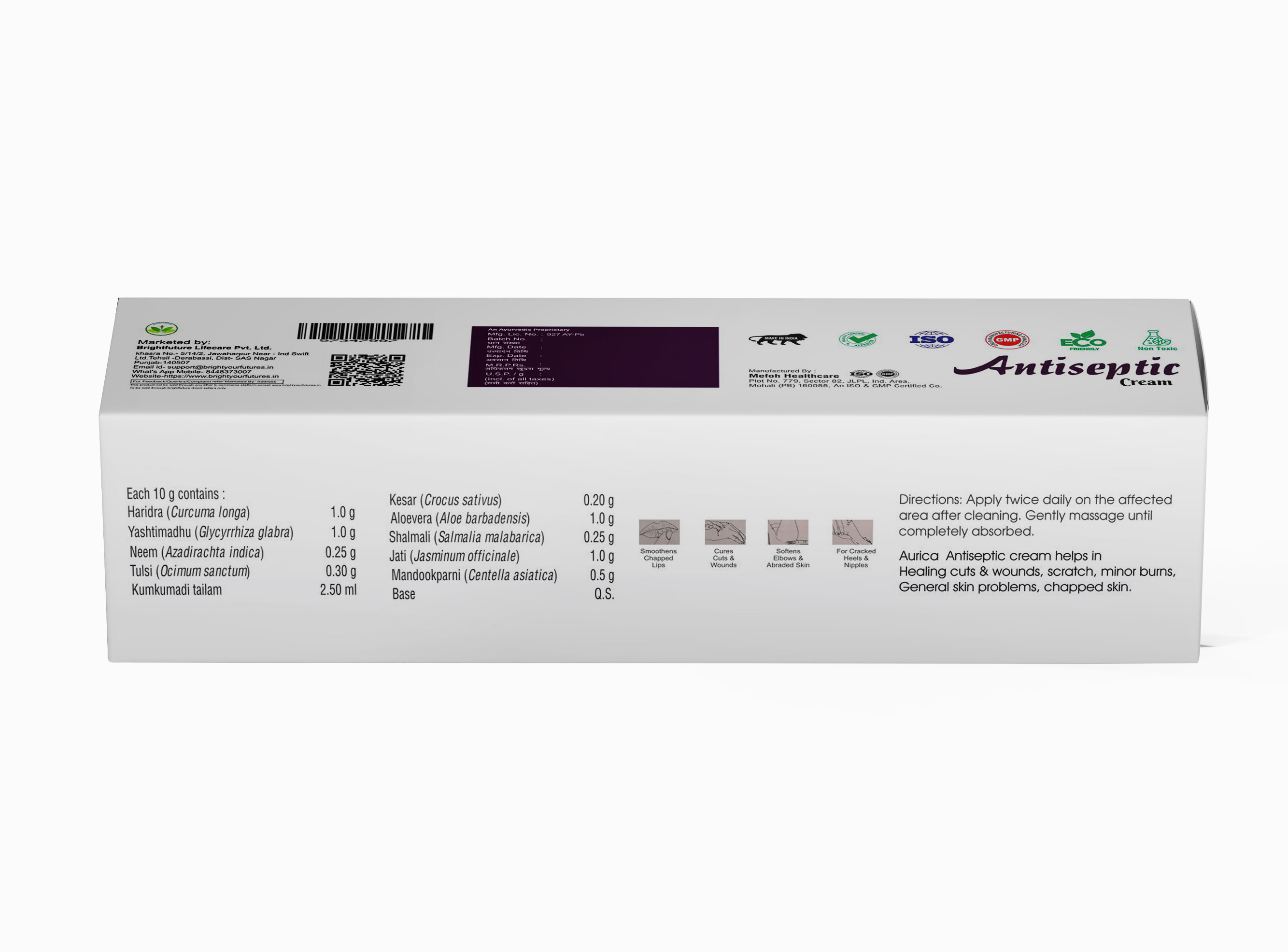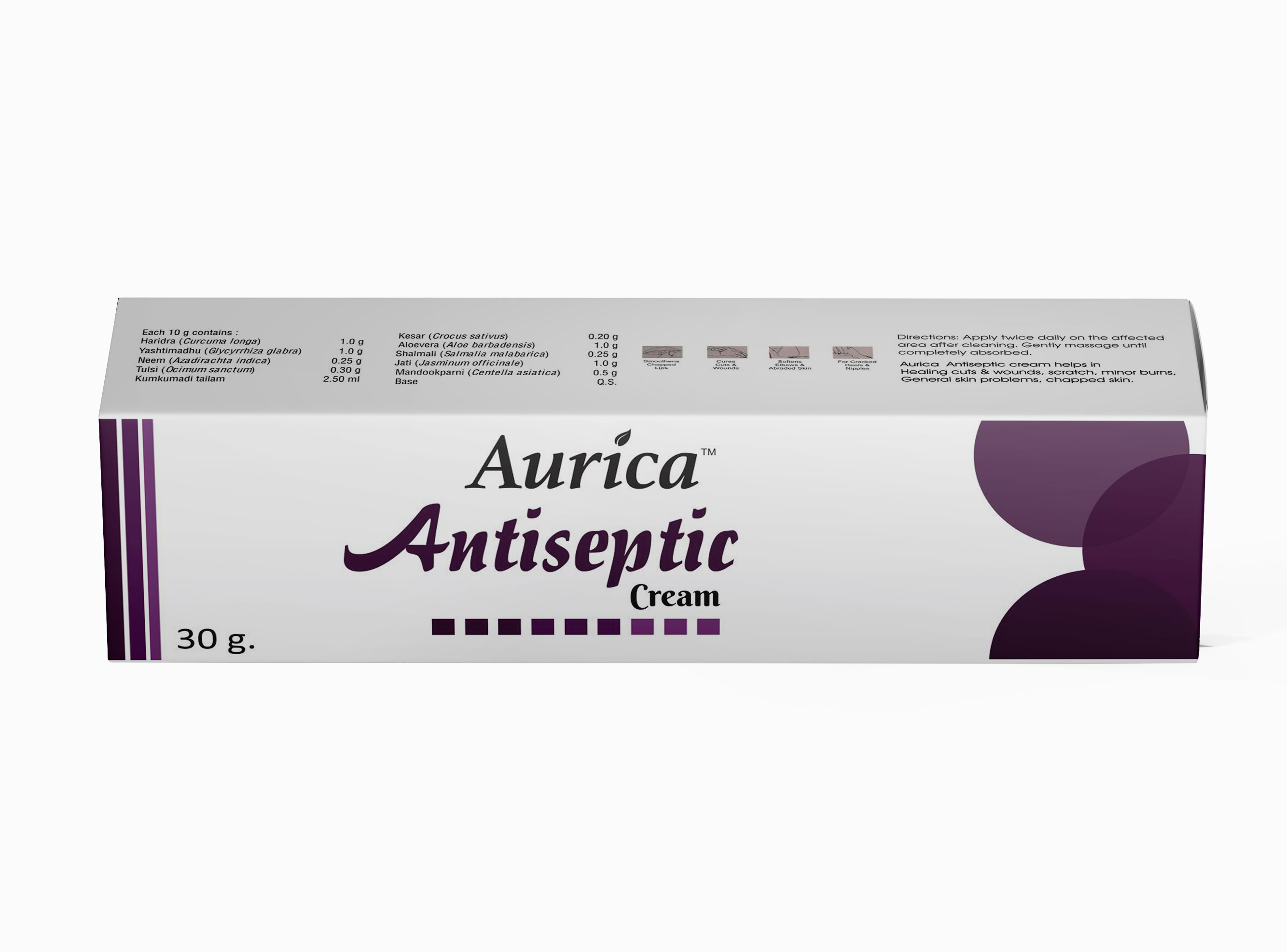 AURICA Antiseptic Cream – Benefits: Prevents Infection Protects cuts, wounds, and minor injuries from germs Heals Minor Cuts & Burns Helps in faster healing of small wounds and burns Soothes Skin Irritation Provides relief from itching, redness, and irritation Antibacterial Protection Fights bacteria and keeps skin safe Moisturizes Skin Keeps the affected area soft and hydrated Useful for Daily First Aid Ideal for small injuries, scratches, and rashes Promotes Healthy Skin Supports quick recovery of damaged skin